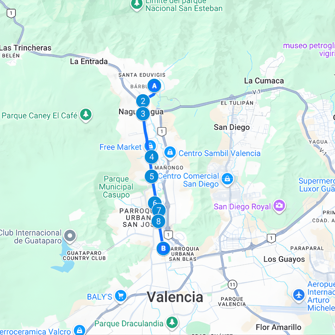 Universidad de Carabobo, Oncológico, Av. Universidad, Naguanagua, CC La granja, Redoma de Guaparo, Av. Bolivar norte, Éxito, Tijerazo, Av. Cedeño